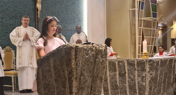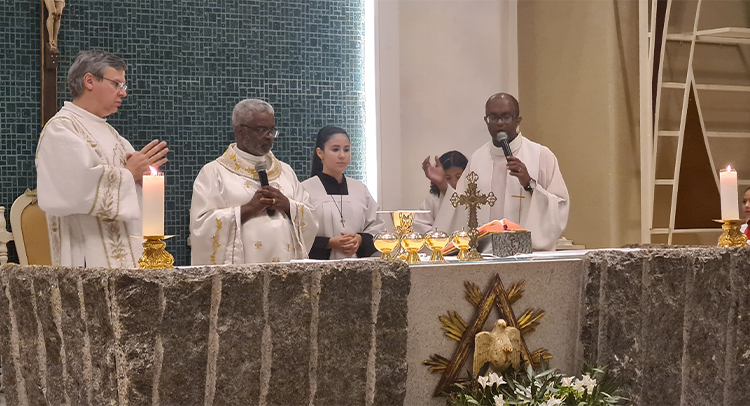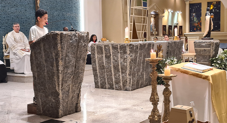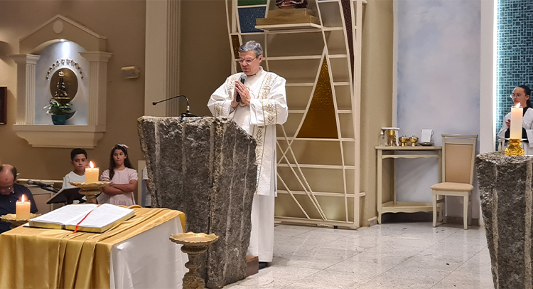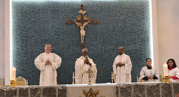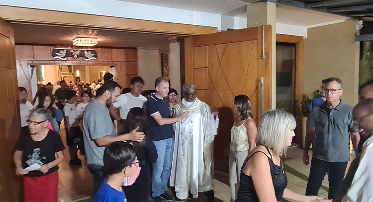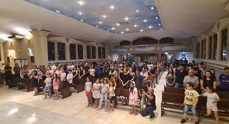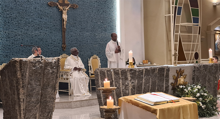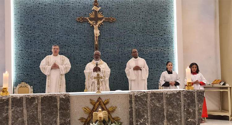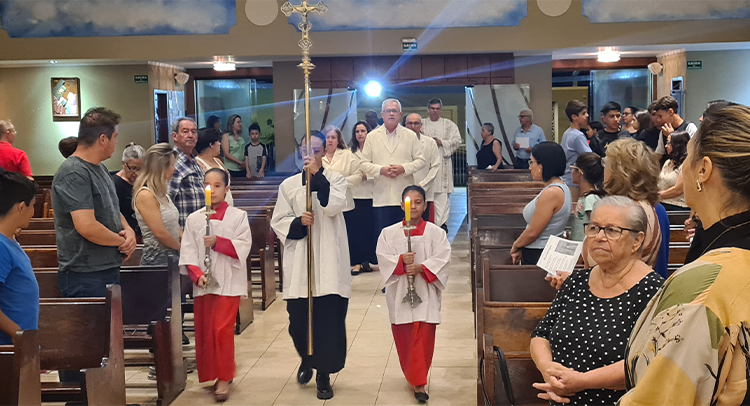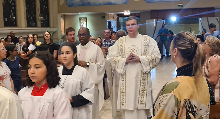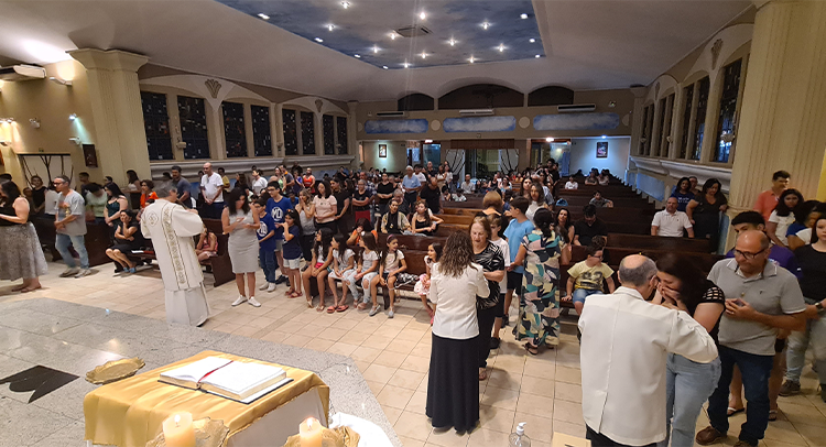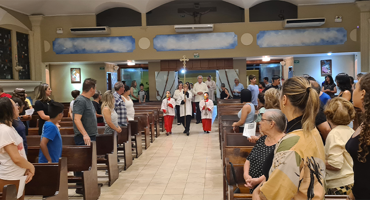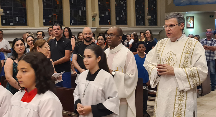 Foi celebrada no dia 18/09/2023 as 19:00, o 1º dia do Tríduo de nossa co-padroeira Santa Ifigênia. A celebração foi presida pelo Padre Celio da paroquia Santa Edwiges, e também contou com a participação do Padre Flavio e Diácono Amélio, juntamente com as crianças da catequese da 1º comunhão e crisma, e elas ajudaram na liturgia. Padre Celio, já foi nosso pároco e expressou a sua satisfação de estar de volta a celebrar na nossa igreja e também reencontrar todos paroquianos. Ele na sua homilia destacou o tema Vocação, disse que é uma graça de Deus a todos nós que recebemos esse dom, e cabe a nós acolher e praticar os ensinamentos de Deus, buscando ser imitadores de Jesus Cristo e colocando ele no centro de nossas vidas. Falou diretamente as crianças, pediu para que olhassem para a imagem de Santa Ifigênia, que ela antes de ser santa foi criança, jovem, mulher e que todo caminho que ela fez, ela sempre colocou Jesus a frente. No Final Padre Celio recebeu os agradecimentos das catequistas responsáveis, Imaculada e Filó e também recebeu um presente delas. Uma celebração festiva, de vários sinais e acompanhada por vários paroquianos.