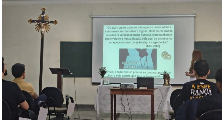 A primeira colocação foi feita pelo Padre Diego falando sobre os princípios que fundamentam a moral e ética cristã da sexualidade e a virtude da castidade. Finalizou encaminhando os casais para um momento de oração, indicando histórias bíblicas de casais que podem iluminar a missão dos casais católicos como sinais de caridade, fidelidade e justiça.