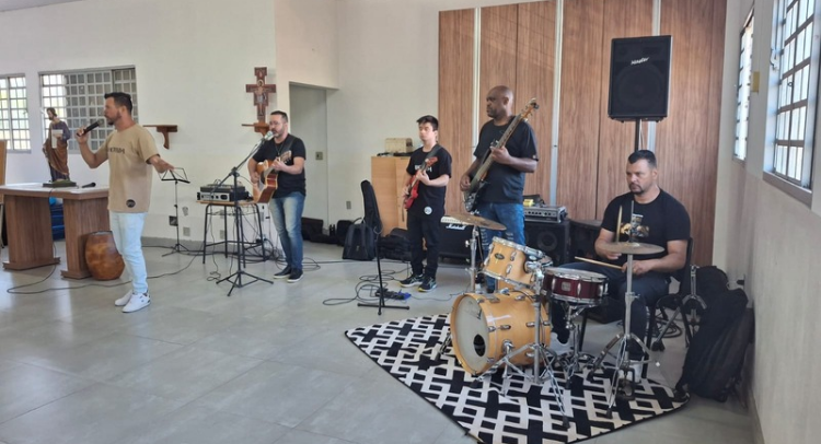 Iniciamos com acolhida e o café da manhã. Depois a banda Dependentes de Cristo conduziu a todos ao momento de oração inicial seguindo de uma animação.